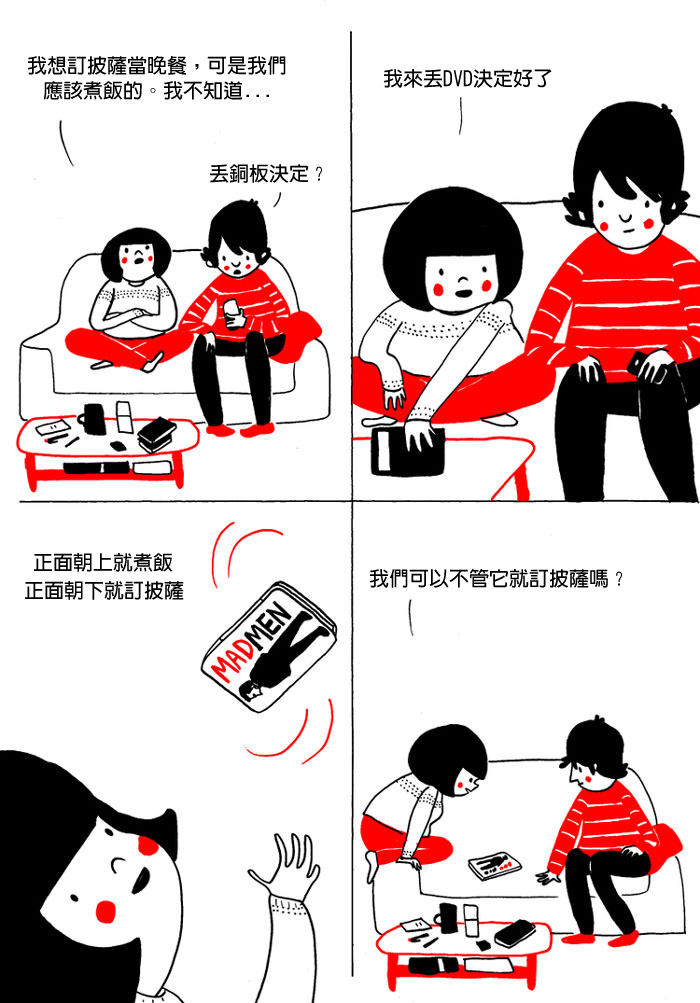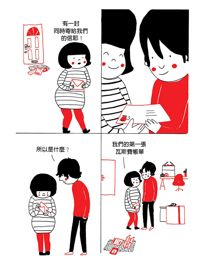 英國插畫家Philippa Rice的作品非常療癒。他用簡單的筆觸勾勒出了溫馨的畫面。這些插畫只有簡單的白紅兩種顏色,卻充滿濃濃的愛意。看完這些插畫你就會明白,只要有愛,靜靜待在對方身邊就感覺很幸福。