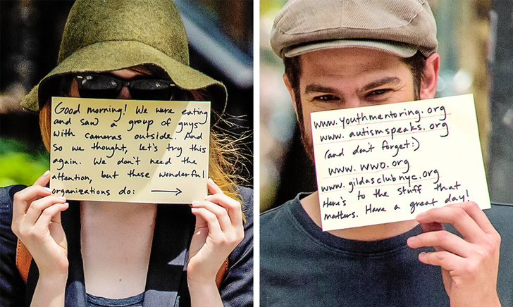 ▼艾瑪史東(Emma Stone)與安德魯加菲爾德(Andrew Garfield),用紙條寫出幾個需要關注的網站讓媒體拍攝。