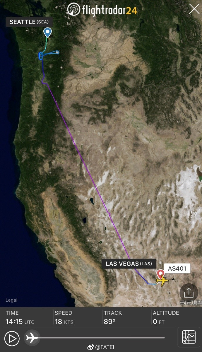 ▼從航空紀錄網站Flightradar24的航線圖中也可以看到AS401航班的浪漫旅程。