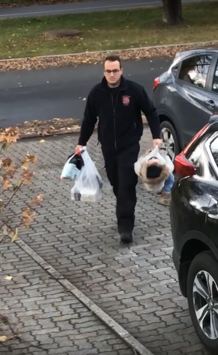 ▼看到女兒這個樣子,爸爸並沒有命令她馬上起身,而是像拎行李袋一樣一手將17公斤重的Juliette拎起來,另一隻手還拿著一包東西,輕鬆的往家裡走去,這可愛的一幕恰好被媽媽看到拍了下來。