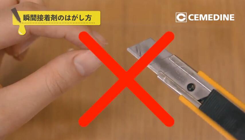 ▼影片中也展示了當三秒膠黏到手時我們經常採用的方法,如用蠻力硬撕,或是拿美工刀試圖割開,但是其實這兩種方法都不實用。