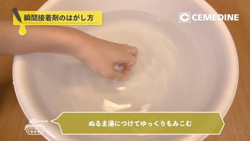 瞬間接着剤で皮膚同士がくっついてしまった時は、ぬるま湯の中でしばらくモミモミすると剥がすことができます。