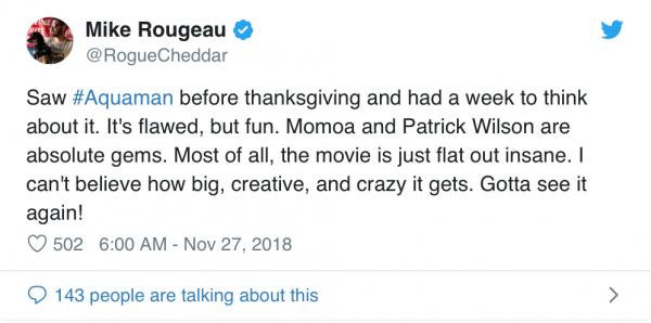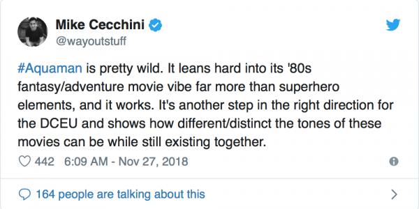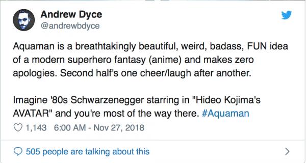 ▼「《水行俠》超棒!他證明了自己不只是亞特蘭提斯的國王,同時也是最新的DC宇宙國王!我等不及想再看了!」