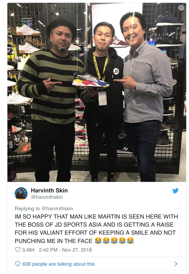 ▼眼看越來越多人都覺得店員被這樣弄很可憐後,Harvinth又再上傳一張照片,帶給了大家一個值得高興的消息!原來他和鞋店的老闆見了,而且還被告知「已經給那名員工加薪」!!