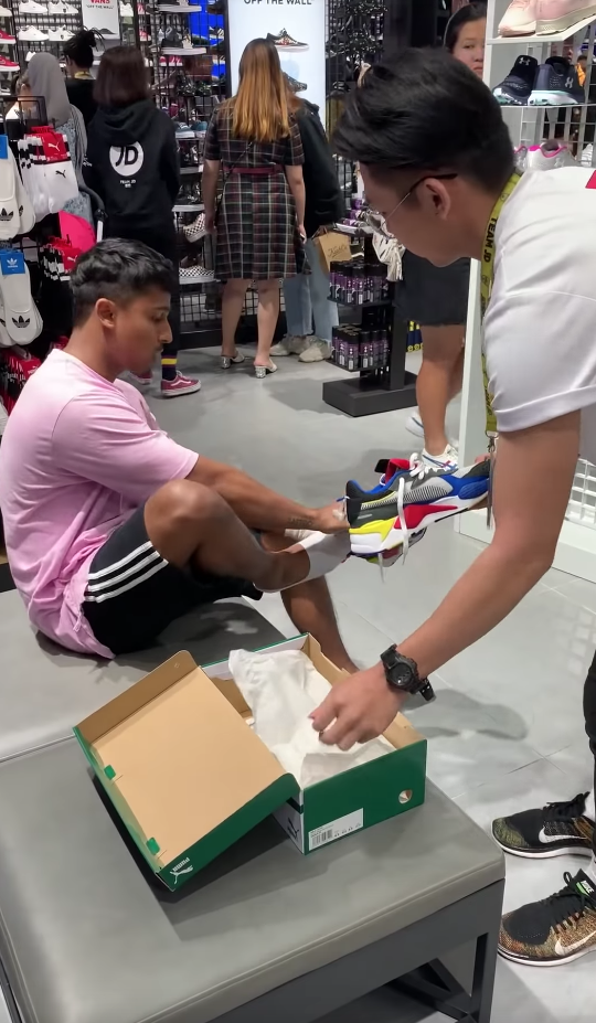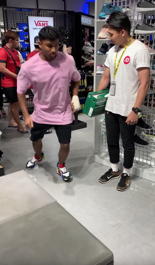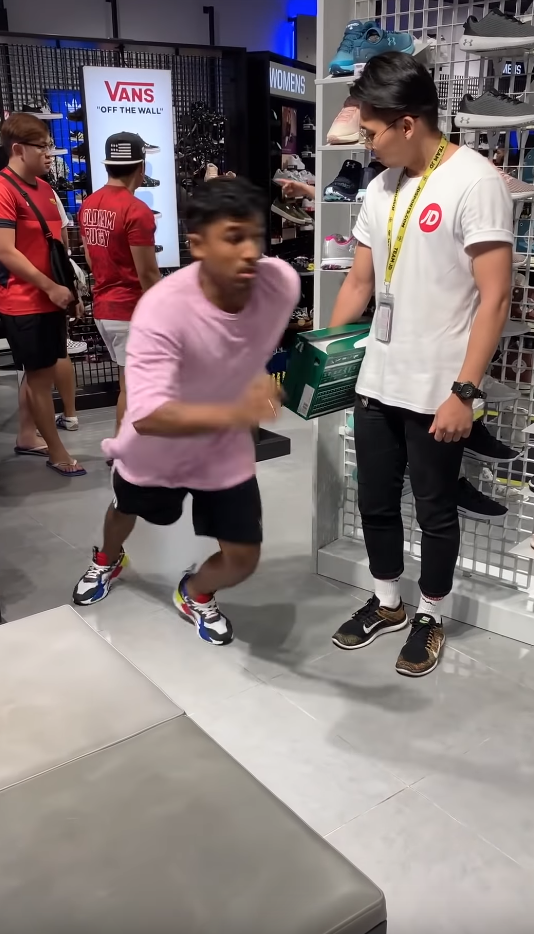 大馬一名網紅「Harvinth Skin」拍攝的影片最近被瘋傳,他在鞋店試鞋的方式讓全世界網友都笑到岔氣!超認真試穿一雙慢跑鞋的Harvinth Skin綁好鞋帶後,下一秒竟然用最快的速度衝出店外,店員當場愣住一秒後才反應過來,嚇到跟著飛奔出去⋯