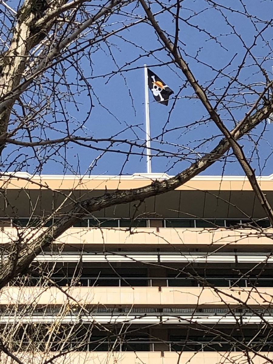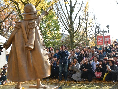 ▼11月30日,熊本縣廳為這座放置在縣廳外公園中的「魯夫銅像」舉行揭幕儀式,還特別升起了海盜旗。