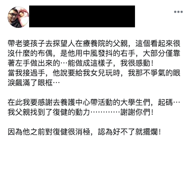 ▼原來父親自從身體不適之後,右手都會不斷發抖,因此「這個看起來很沒什麼的布偶,大部分是僅靠著左手做出來的」!他同時也透露,爸爸之前對復健很消極,對於身體狀況一直保持負面想法,因此他內心也十分感激到養護中心帶活動的大學生們,「起碼…我父親找到了復健的動力」。