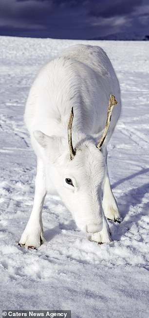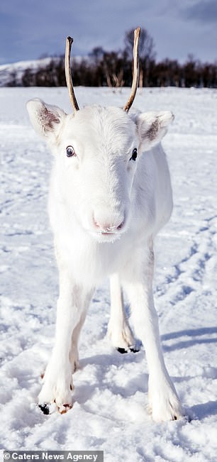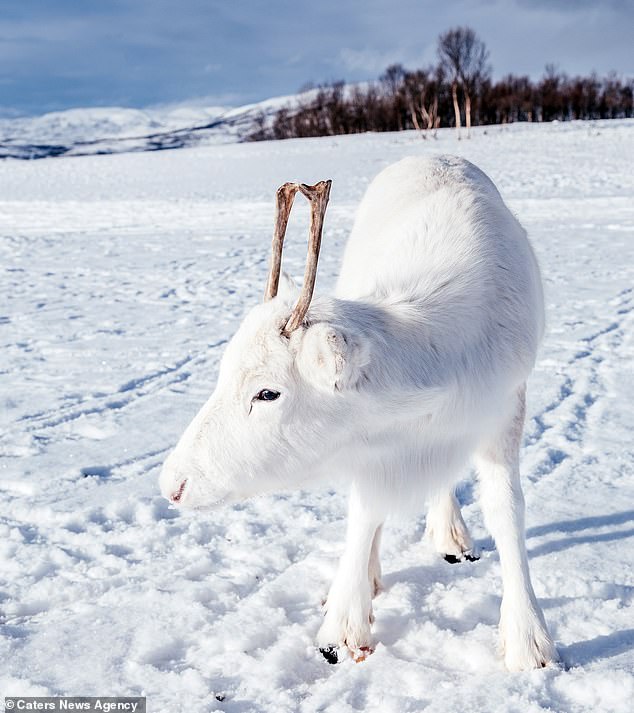這些小馴鹿渾身雪白,幾乎與白色的背景融為一體。牠就像童話中的小精靈,真是太美了。