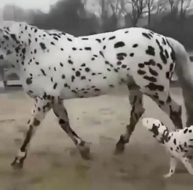 ▼狗狗還以為遇到了同類,其實人家是馬啦。