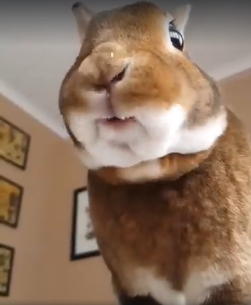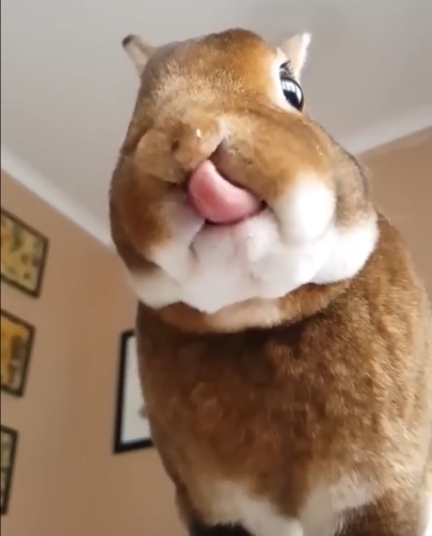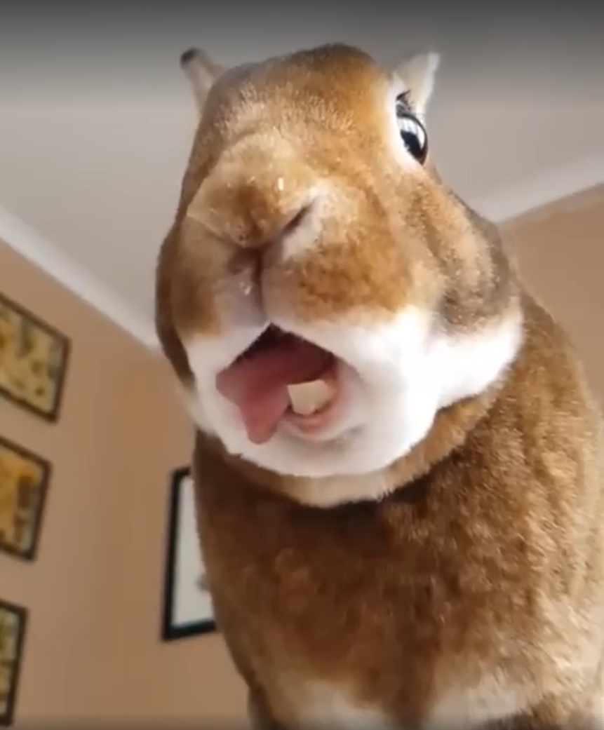 只能說這樣由下往上拍的視角,實在是太cute了啦!那毛絨絨的雙下巴,粉嫩的小舌頭,萌萌的小兔牙,再配上水靈的大眼睛。瞧兔兔吃得津津有味的樣子,不管牠嗑了什麼,都給小編來一份吧!