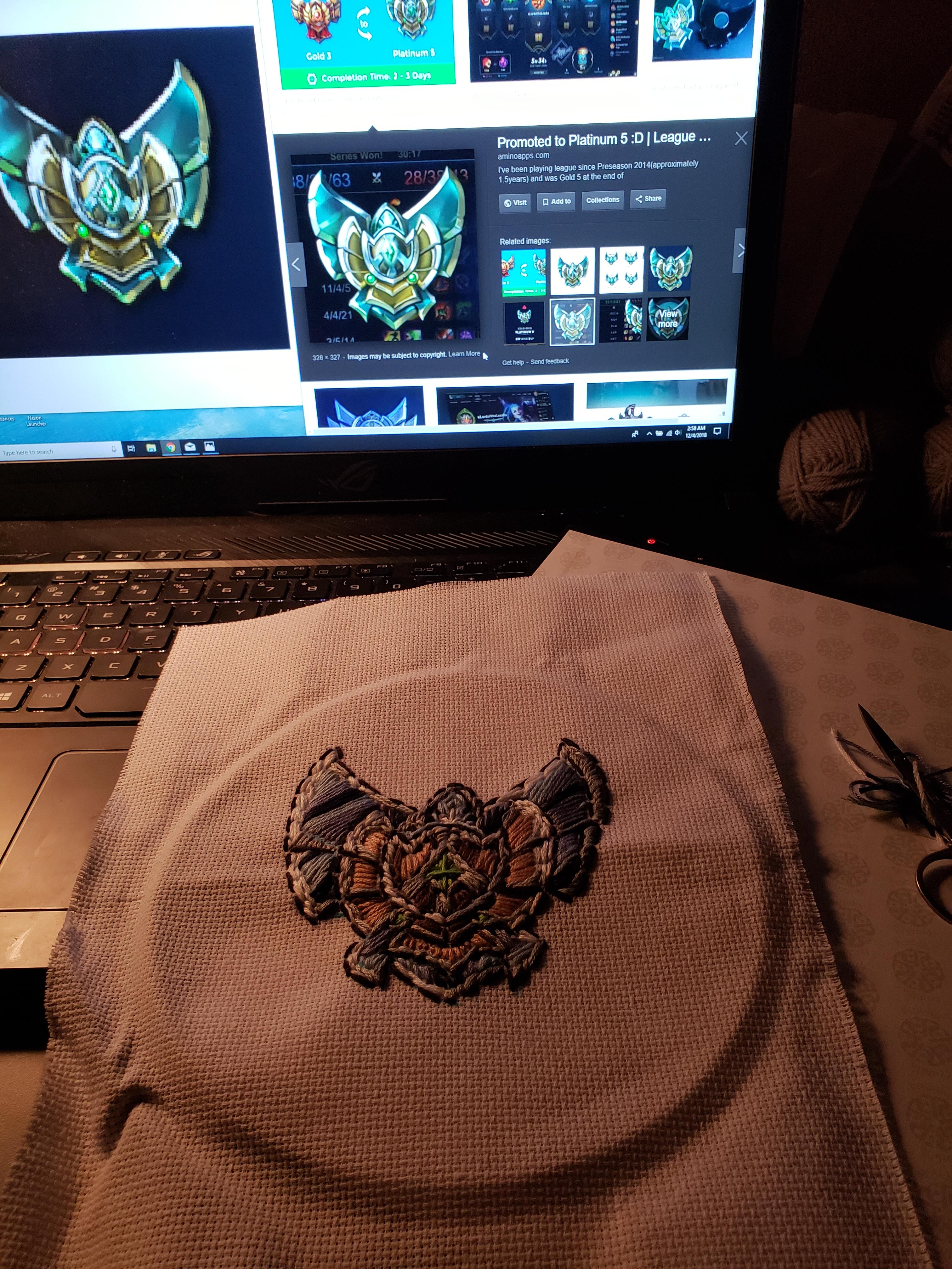 ▼這種女友到底怎麼找到的啦!?國外論壇一名ID「KimchiChigga」的女子在LOL板上分享說:「我的男友趕在賽季結束前上了白金,我想不到該如何慶祝,於是親手做了一個『白金刺繡』給他。」