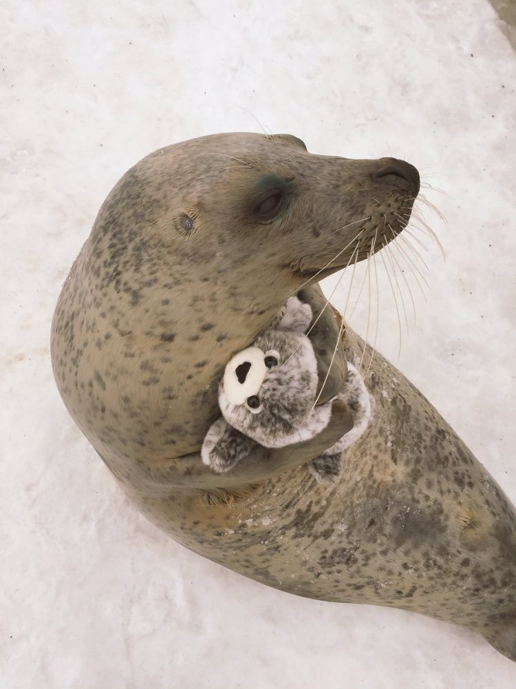 2018年12月09日日本北海道的一間水族館裡有一隻超人氣小海豹,乖巧可愛的牠收到了飼養員送給牠的小禮物,一個迷你版的「海豹玩偶」,小海豹顯然很喜歡這個禮物,將它緊緊抱在懷裡。