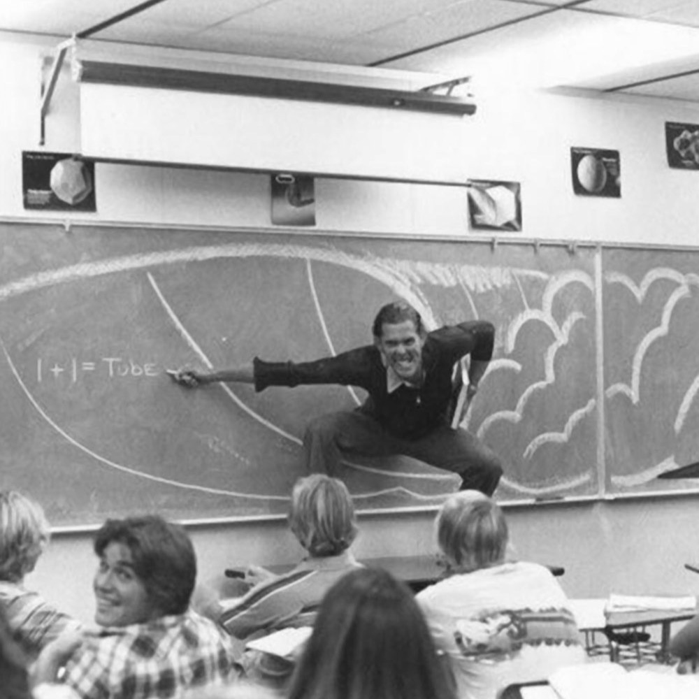 ▼1970年代,高中數學老師正在解釋衝浪的物理方式。