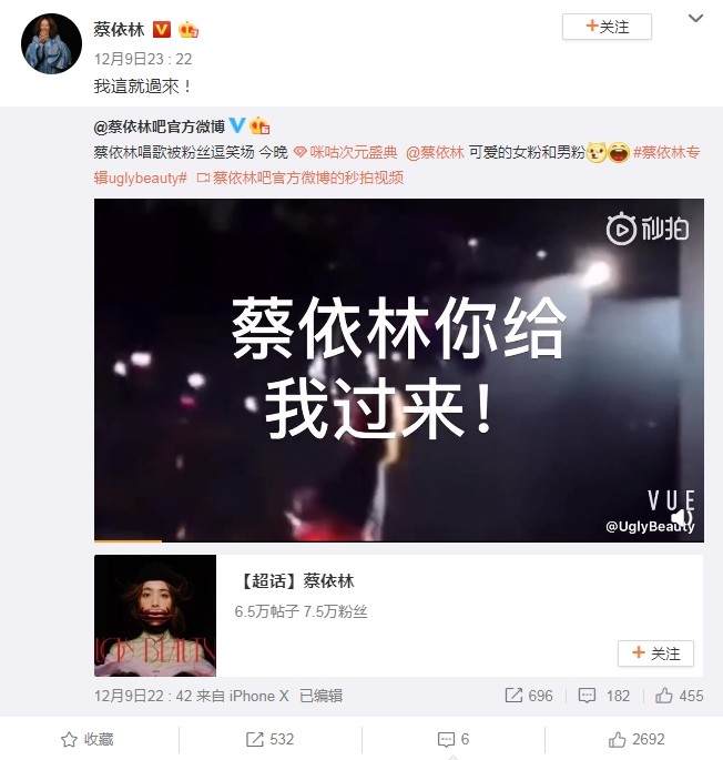 2018年12月11日天后蔡依林(Jolin)出道多年,擁有超高人氣。12月9日,她現身上海寶山體育館,參加「咪咕次元盛典」,並上台演唱招牌歌曲《日不落》。台下的粉絲看到她後超激動,大喊她的名字,讓她唱到一半忍不住笑場。