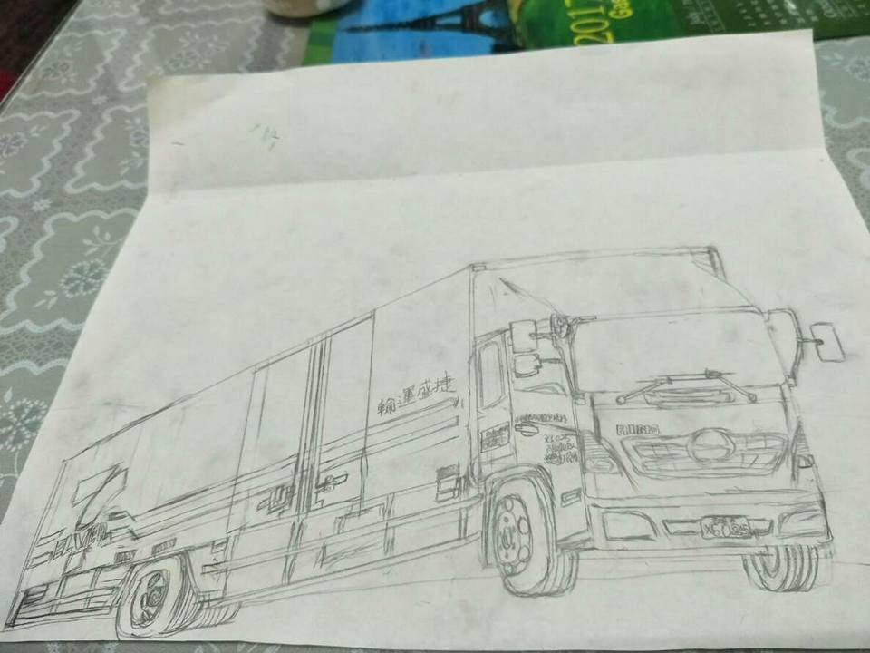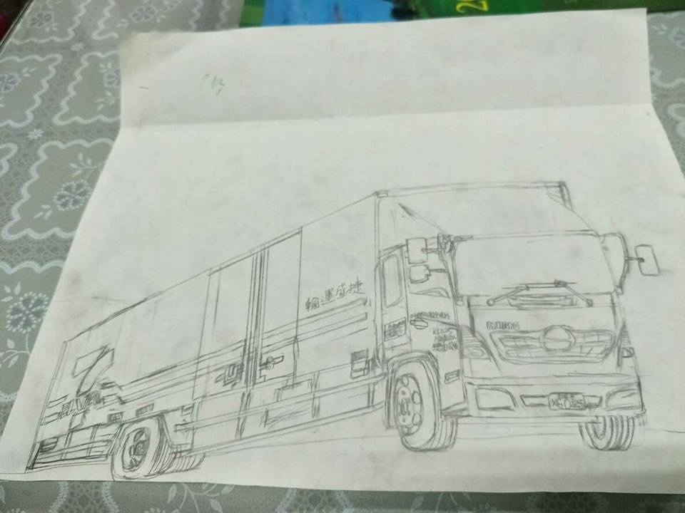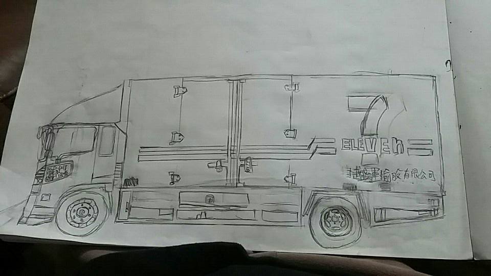 ▼仔細看他的作品,完美的將便利商店物流車的樣子用鉛筆素描了出來,可見他的結構感是非常好的!