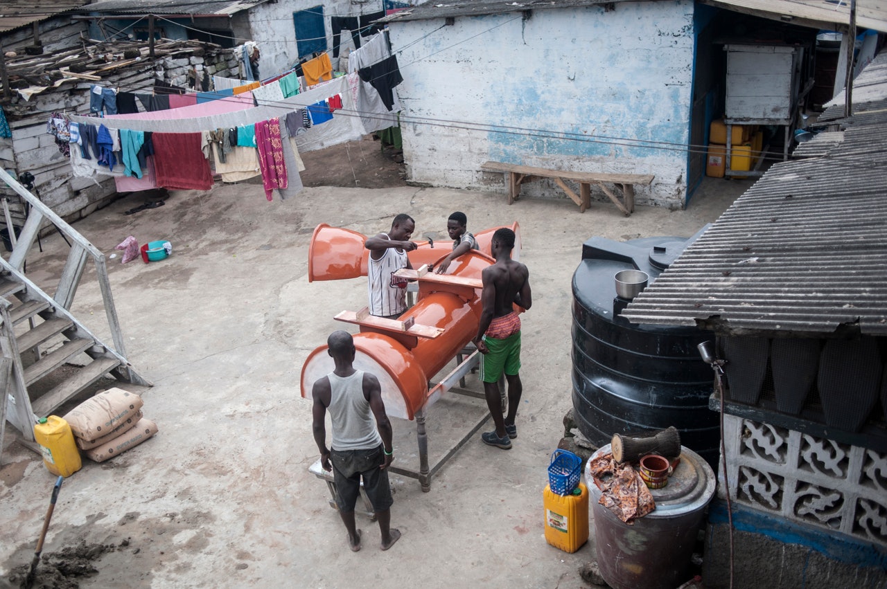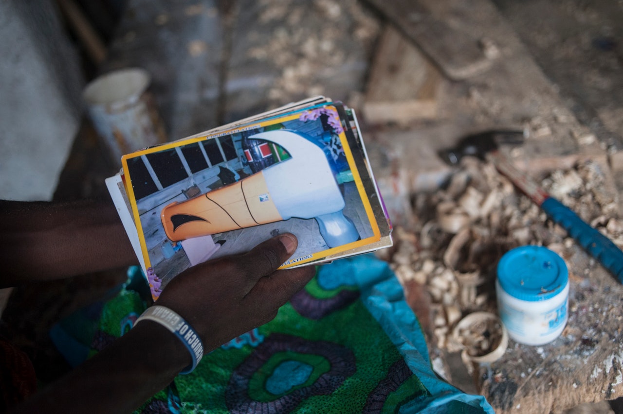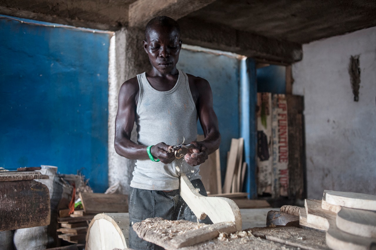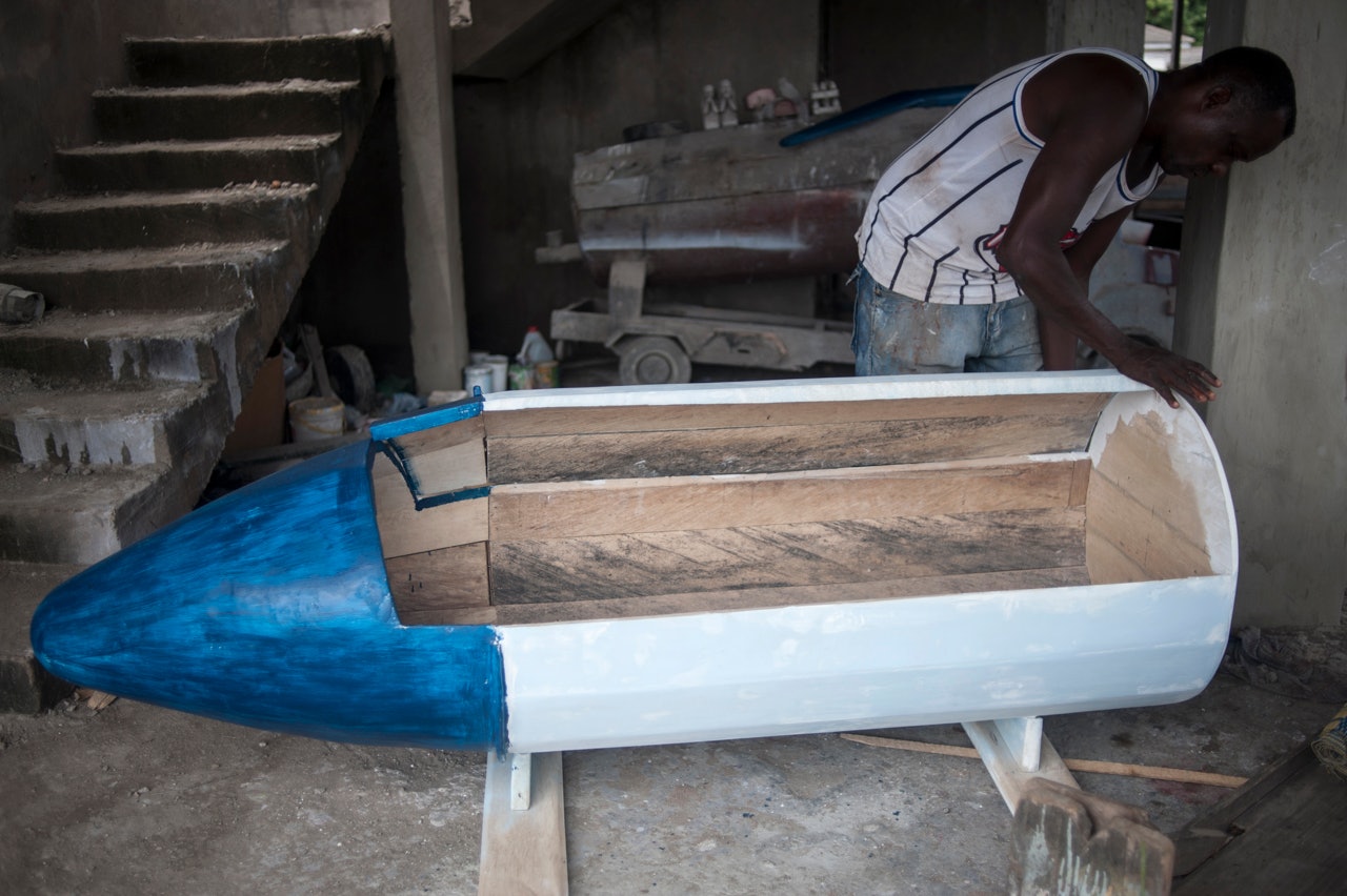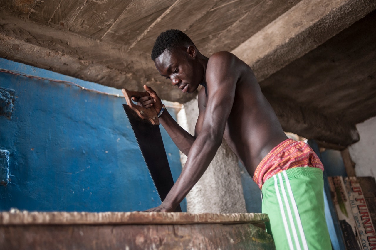 ▼Hello Design Coffin是迦納首都加克拉的一位棺木製作學徒,他正在刨木製作棺材。