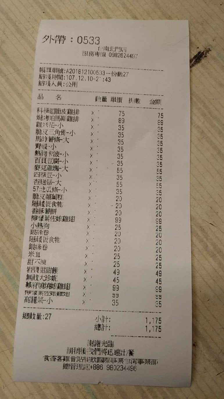 ▼當然有不少網友都很好奇,像這樣霸氣的買完菜單上全部餐點,需要花多少錢?女網友隨後附上了單據,一共花費了1175元台幣。另外也有人關心女網友的健康,提醒她一個禮拜吃四次雞排,確實不太好。女網友也及時回應,說明自己平時都有在規律運動,所以體重和身型都維持得不錯,但未來還是會減少吃雞排的次數啦!