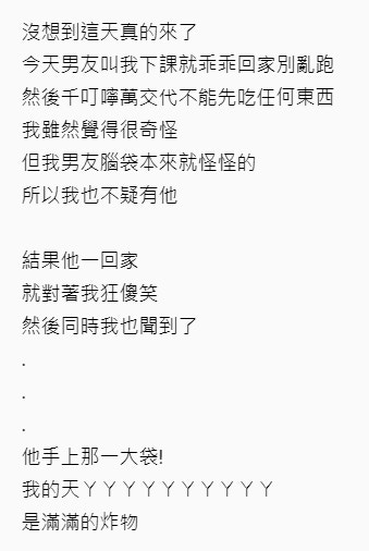 ▼超愛吃雞排的女網友,其上癮程度讓男友都忍不住稱她為「G排人」。某天她在Dcard討論區發帖,告訴了大家有關於她夢想成真的故事。XD