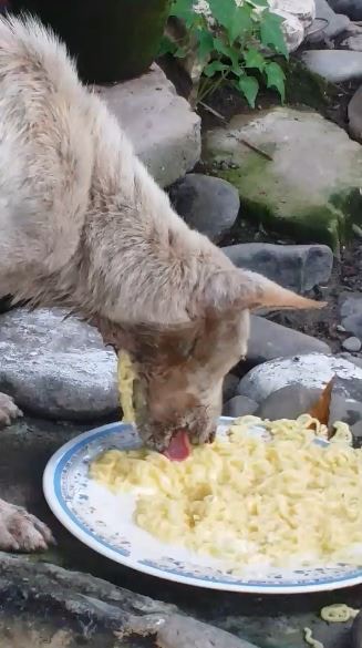 ▼從網友所分享的影片可以看到,因為看到這隻流浪狗太過於飢餓了,在街上又找不到食物,於是端了一碗吃剩的麵給牠充飢。