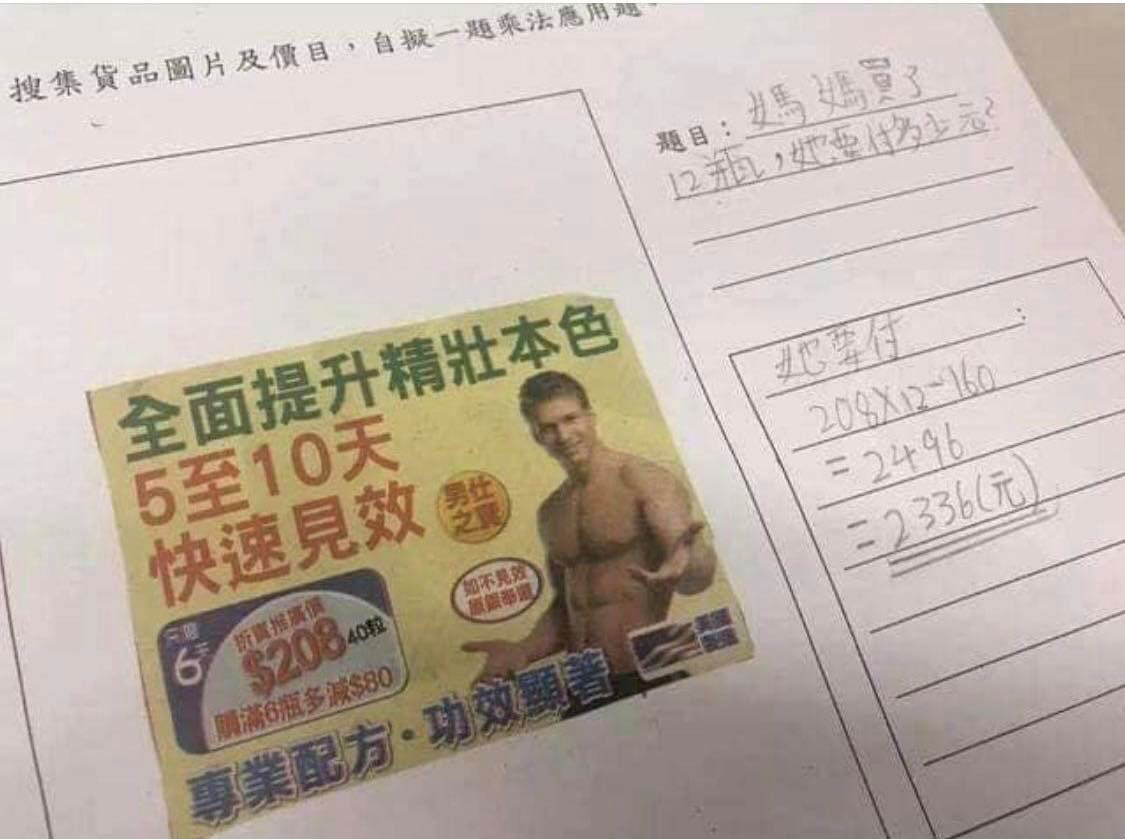▼題目寫着「搜集貨品圖片及價目,自擬一題乘法應用題」,結果小學生居然好挑不挑,挑中了令人尷尬的廣告圖。接著題目還寫下「媽媽買了12瓶,她要付多少元?」,網友看到這裡都噴飯了。
