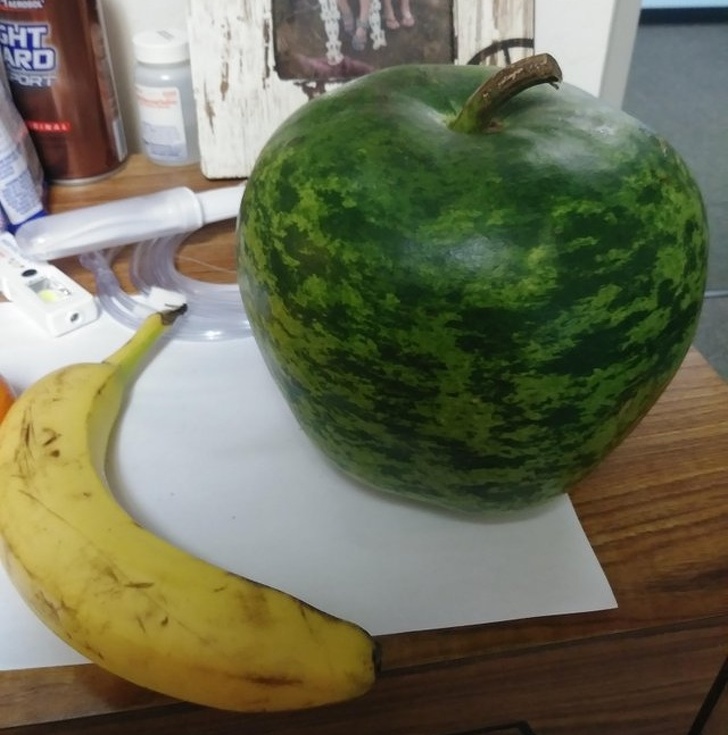 ▼外表看起來像西瓜,形狀看起來像蘋果,其實這是一顆南瓜!