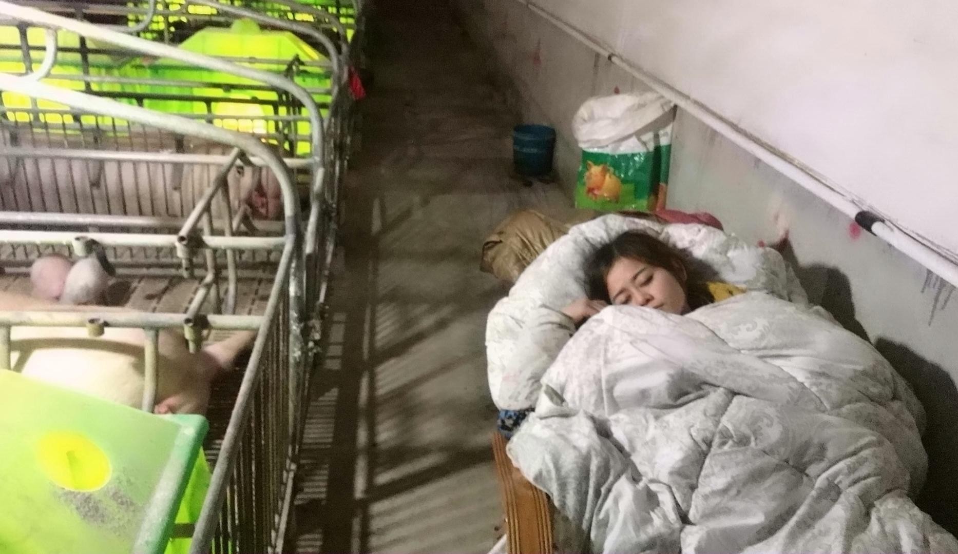 ▼產房中的工作很繁瑣,但至關重要,很難請到合適的人,肖芳就自己做。為了照顧母豬和小豬,她常常熬夜,有時候一天只能睡6個小時。每年冬天,肖芳都會搬到豬圈陪小豬,因為小豬一生下來就得放進保溫箱,母豬生產過程中也很危險,需要有人在旁時刻守候。肖芳每年都會在豬圈中住3個月,直到天氣變暖才搬出來。