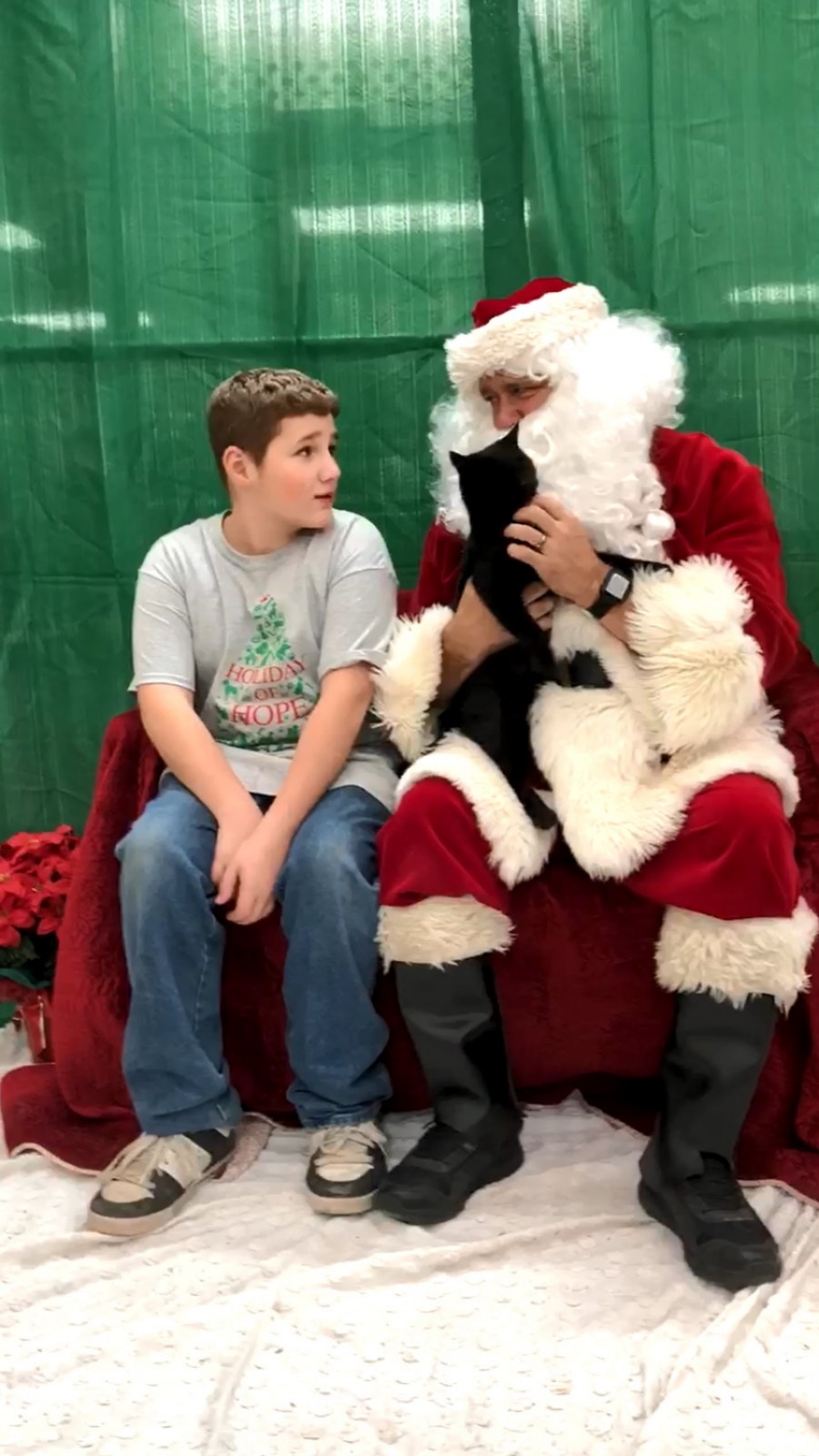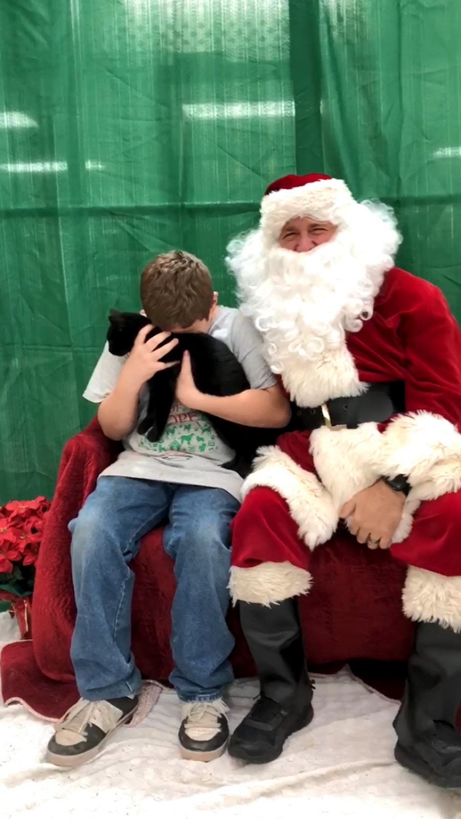 ▼媽媽悄悄為這隻貓咪辦理了領養手續,但沒有告訴Austin。12月1,HSGC舉辦了另一場領養活動,並請來聖誕老人與大家合照。媽媽讓Austin與聖誕老人合照,拍了幾張照片後,聖誕老人突然說:「今晚小貓咪便可以與你一起回家。」說著還把Gizzard遞到了他手中。