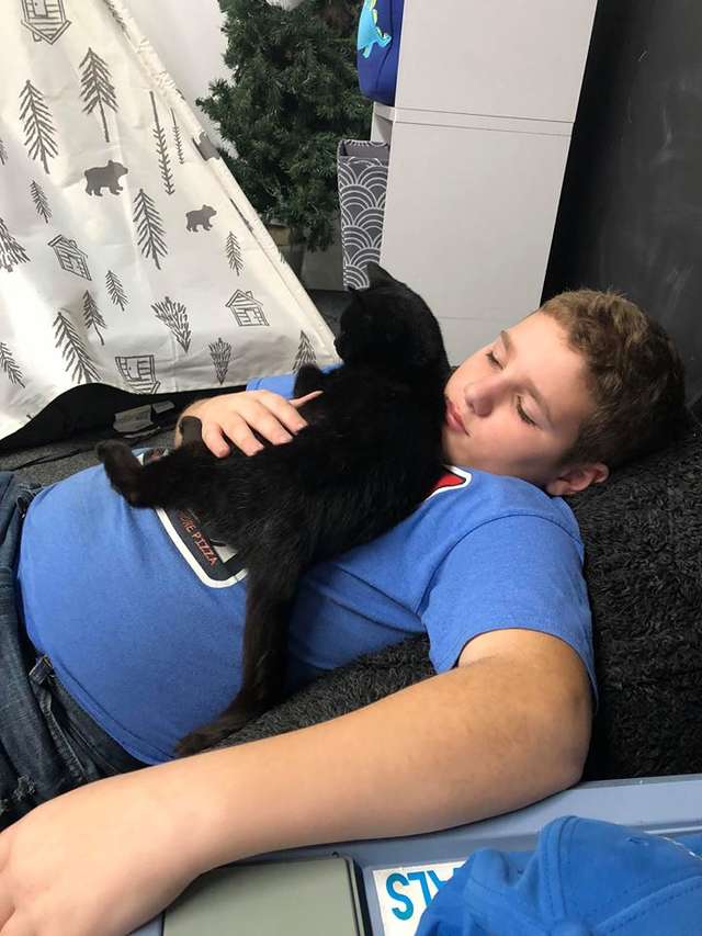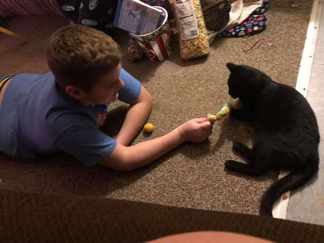 ▼不久前,Austin和媽媽一起參加了一個貓咪領養活動,其中一隻叫Gizzard的小黑貓與Austin一見如故。牠還爬到Austin的腿上,放鬆地躺下來休息。媽媽發現Austin很喜歡這隻貓咪,決定給他一個驚喜。