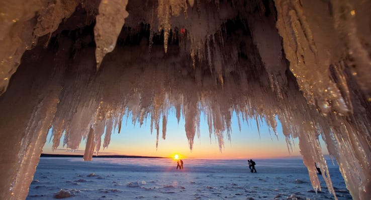 ▼美國威斯康星州,高達60英尺沙岩的「使徒群島冰洞」(Apostle Islands National Lakeshore)。