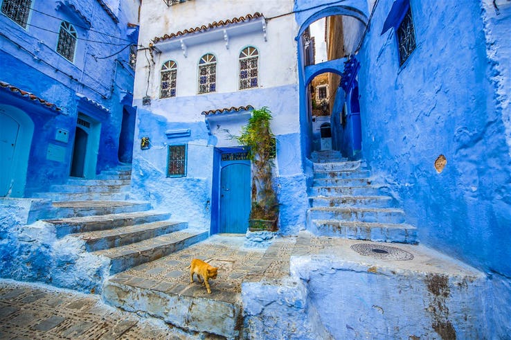 ▼摩洛哥,美麗的藍色小鎮「契夫蕭安」(Chefchaouen)。