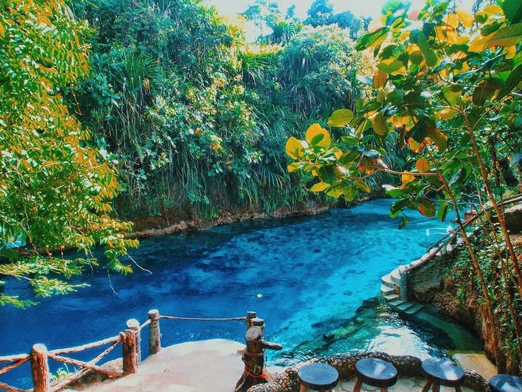 ▼菲律賓,如同藍寶石一般令人著迷的「魔幻之河」(Hinatuan Enchanted River)。