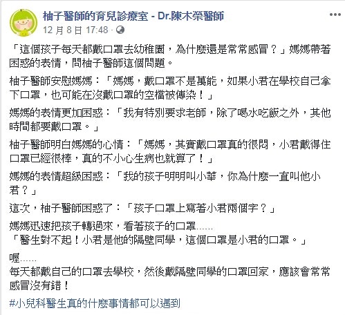 ▼小兒科醫生陳木榮在臉書專頁「柚子醫師的育兒診療室」中,分享了一則問診時的趣事。早前一位媽媽困惑地找到了醫師,並表示孩子每天都戴著口罩去幼稚園,但不知為什麼仍然常常感冒。陳醫生安慰地說:「口罩不是萬能,只要有其中一方拿下來,就有機會互相傳染。」醫生也一直叫著孩子的名,打算詳細問診。