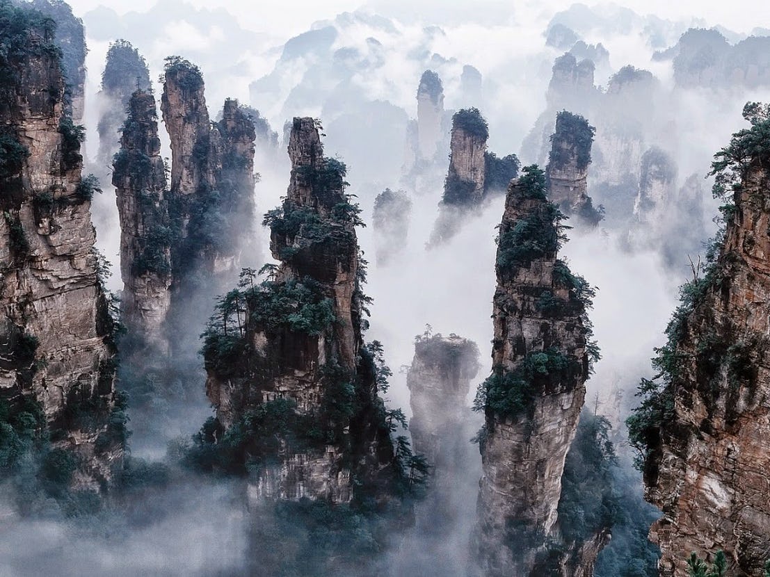 ▼一片汪洋大海下沉後由風力水流侵蝕形成的天子山。