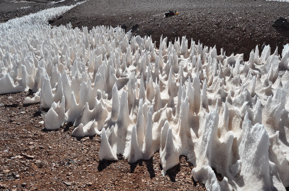 ▼高海拔地區的雪因為太陽照射直接昇華,形成了一個個小小的「雪峰」。