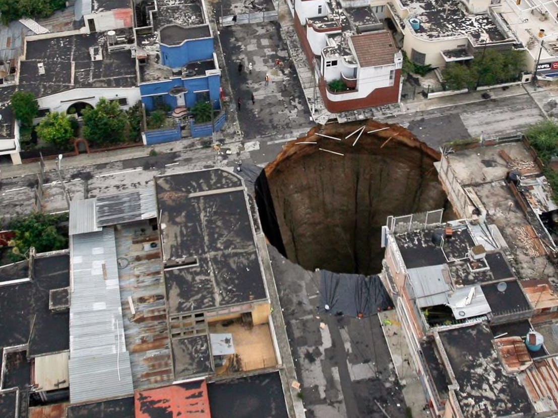 ▼2015年5月30日,在連日豪雨後,瓜地馬拉城城區出現的一個直徑20米,深約90米的天坑。