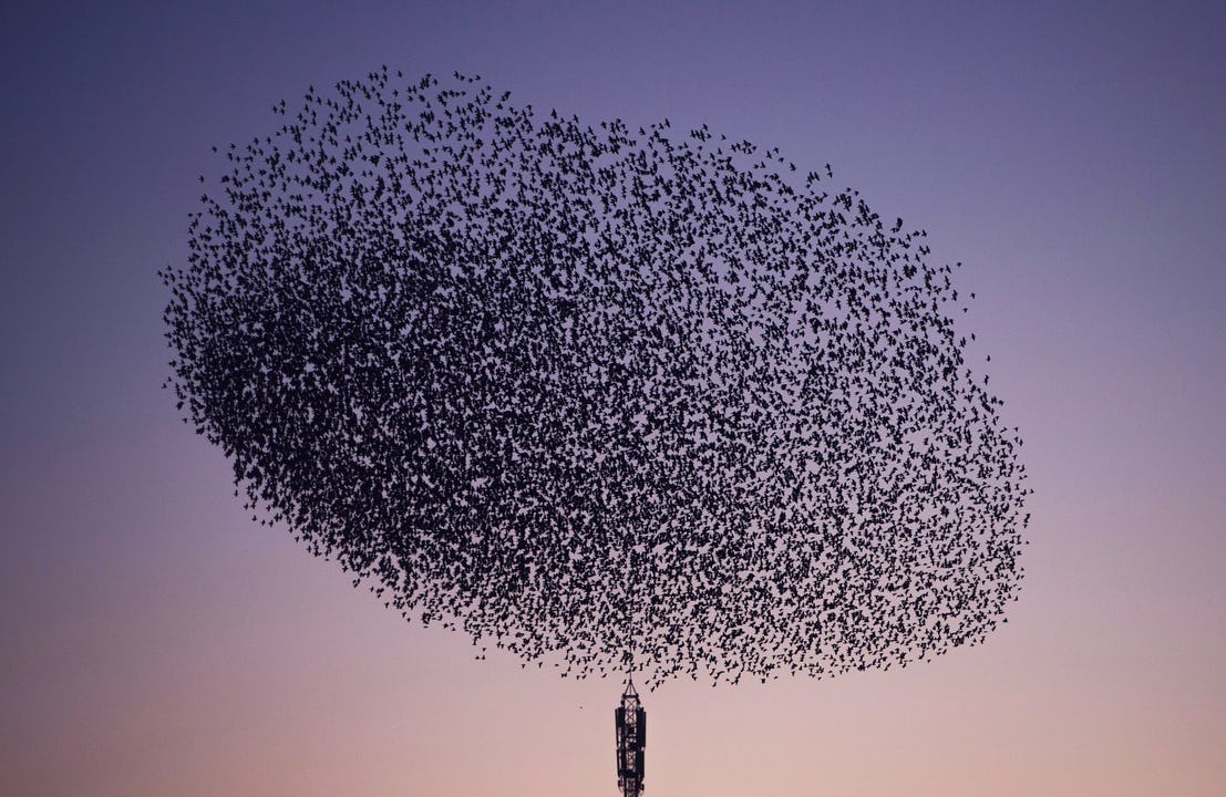 ▼椋鳥叫聲多變,可以模仿周圍的聲音。椋鳥組成「V型」飛過天空,遮擋了太陽。