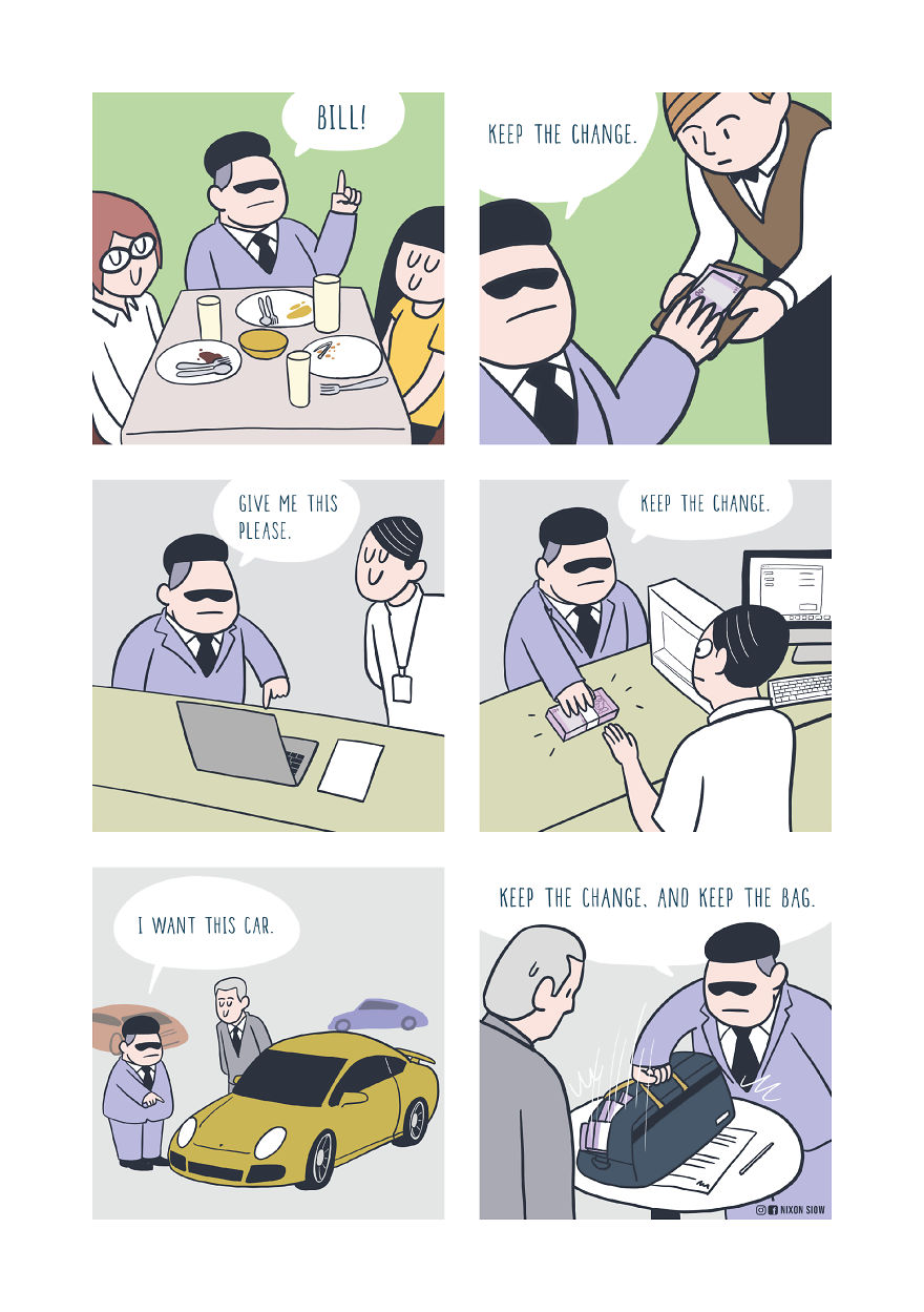 2018年12月14日普通人很難去想像有錢人的日常,畢竟他們的一舉一動都異於常人。漫畫家Nixon Siow就嘗試以有錢人的角度去畫出各種爆笑的幻想漫畫,讓大家可以笑看他們的日常。錢在他們眼中就是一切,只要有錢就可以做到任何的事。