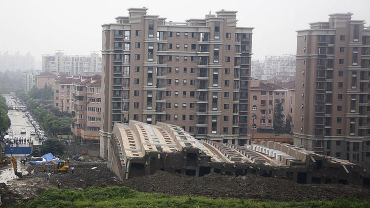 最有名的豆腐渣工程之一,連美國華爾街也報導過。整棟大樓是從底部以「連根拔起」的方式倒下,大樓的地基也清晰可見,震驚全球。