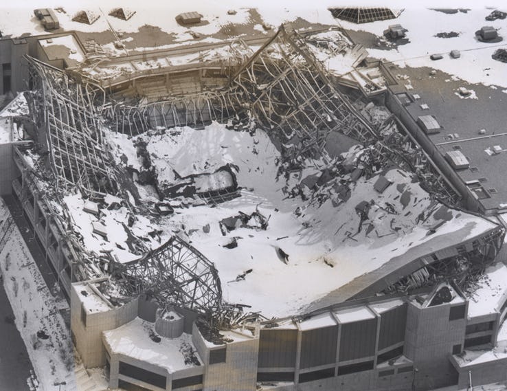 1978年的康乃狄克市政中心用了突破性的屋頂設計,沒想到這會導致一場噩夢發生。5年後的一場大雪,竟然造成屋頂倒塌,所幸沒有任何人受到影響。根據報導,當時的建築師已經發現現實的結果和電腦計算出來的結果不一樣,恐怕會發生預料之外的事,但是他們最終還是選擇相信電腦的結果,最後就真的出事了。