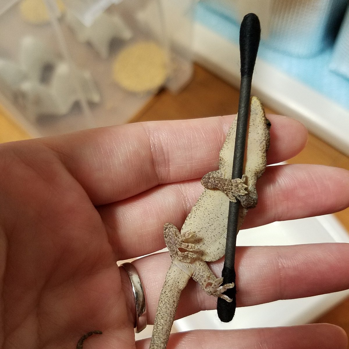 ▼日本網友@choro63choro養了一隻守宮「おぐ(Ogu)」,經常在推特上分享牠的可愛日常。一天網友拿出棉花棒和以前一樣想要幫守宮擦掉手指上脫下的皮,沒想到小可愛竟然緊緊抓住棉花棒不鬆手,還和主人玩起了拔河。