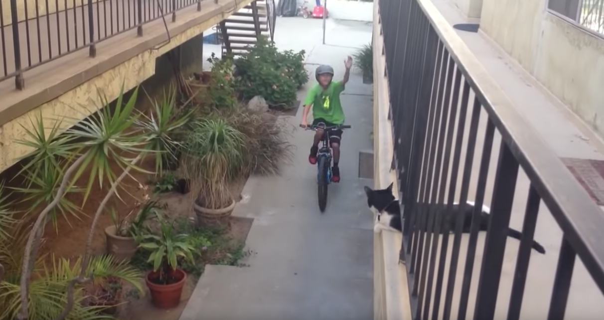▼貓咪慵懶躺在二樓陽台上,小男孩騎自行車經過時與牠打招呼,牠就像看到老朋友一樣舉手和小男孩GIVE ME FIVE,一人一貓超默契,讓人很羨慕。