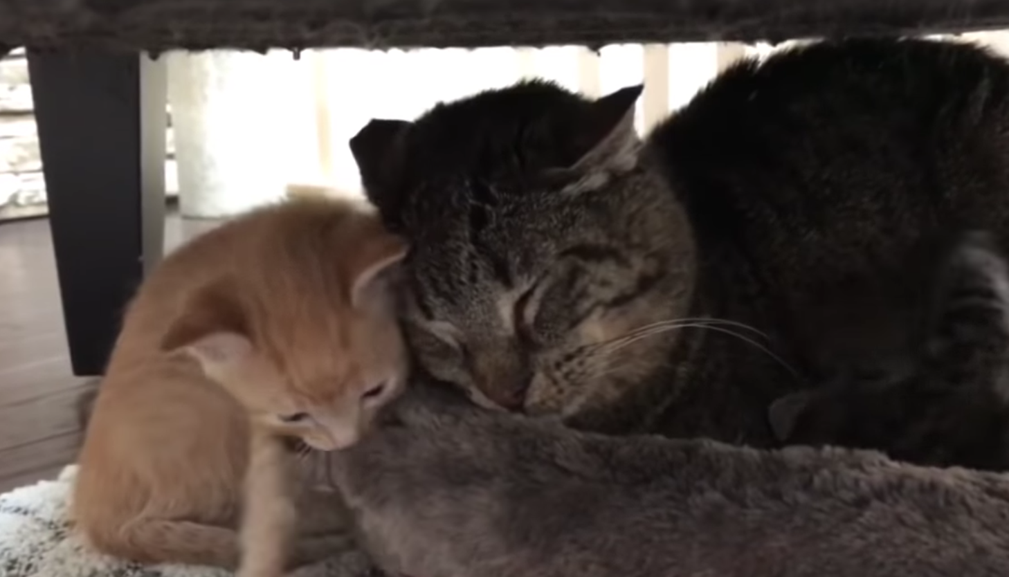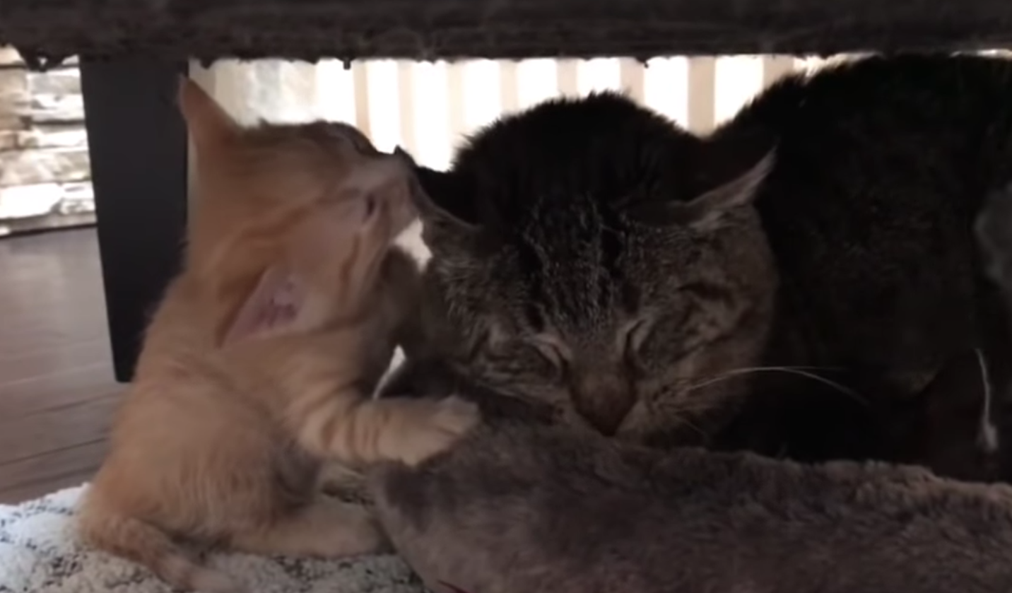 ▼牠們不但睡覺時會黏在一塊,小貓還會主動抱曼森爺爺。在獲得溫暖與愛之中,曼森爺爺也變得相當親人,讓人十分感動!