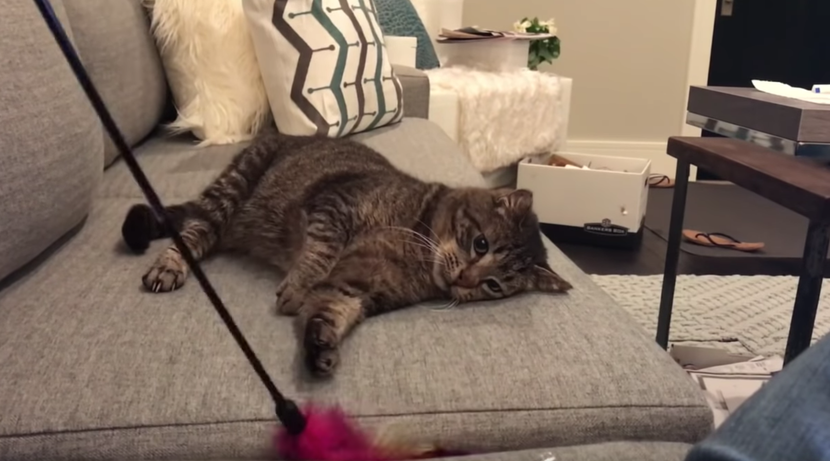 ▼但在一天一天的時間過去後,曼森爺爺終於逐漸放鬆下來,幾個月後,牠也會坦著肚肚跟人玩逗貓棒。雖然曼森爺爺還是不喜歡給人碰,但牠的模樣顯然開心不少!