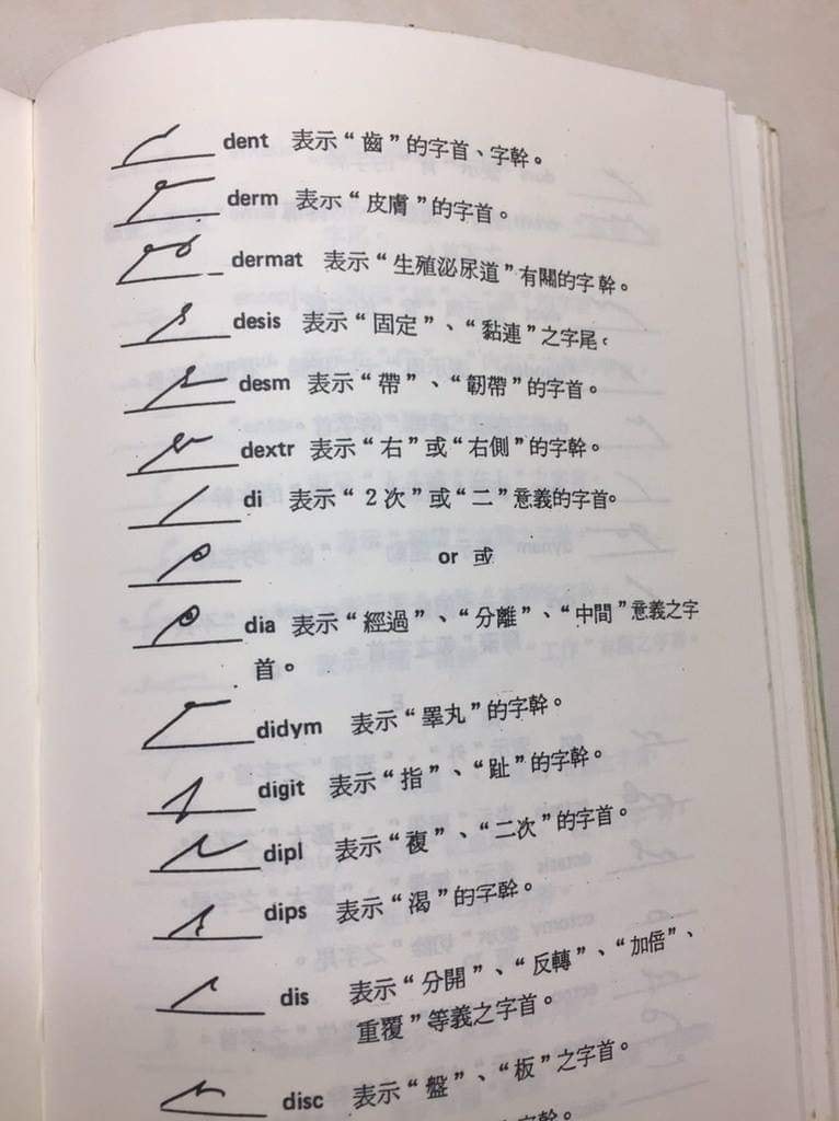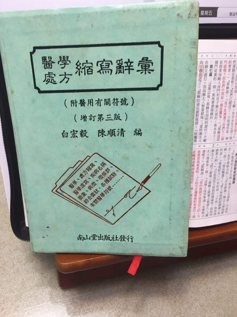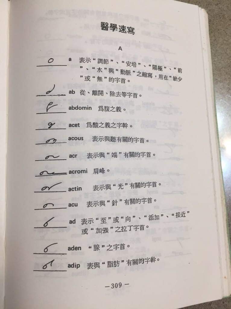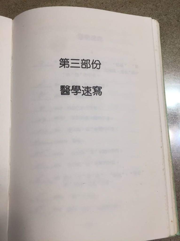 ▼原po分享的這本醫書,是南山堂出版社發行、白宏毅及陳順清編撰的《醫學處方縮寫辭彙》。書中「醫學速寫」這一章節中,詳細列了很多相對應的符號。原po忍不住感嘆:「原來醫生藥單上面鬼畫符不是亂寫的欸…」