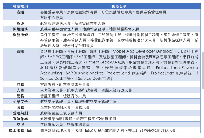 ▼這次招募的職缺包括航空客貨運收益管理及行銷、顧客服務、會員業務、機場地勤作業等。同時新增數項BI商業智慧相關職缺,包括資料倉儲&BI商業智慧工程師、網站數據管理人員、數據交換管理主管、數據策略及規劃設計管理主管,希望通過數據分析來了解、發現旅客需求,並不斷優化各項服務。