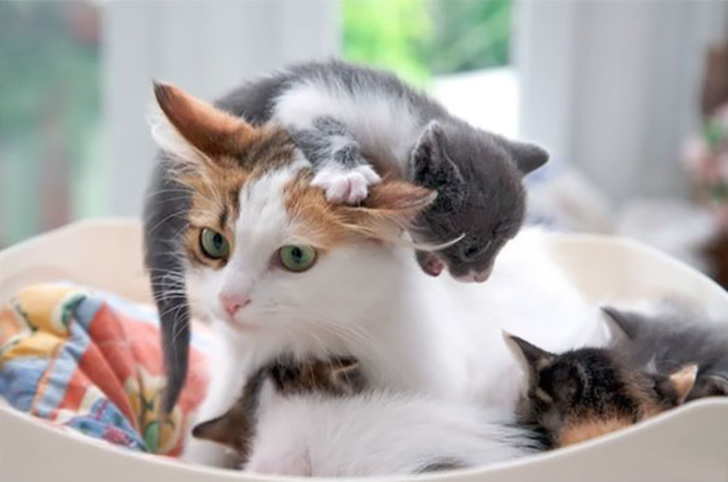 ▼雖然被小孩爬到頭上了,貓媽媽仍然一臉冷靜的模樣!