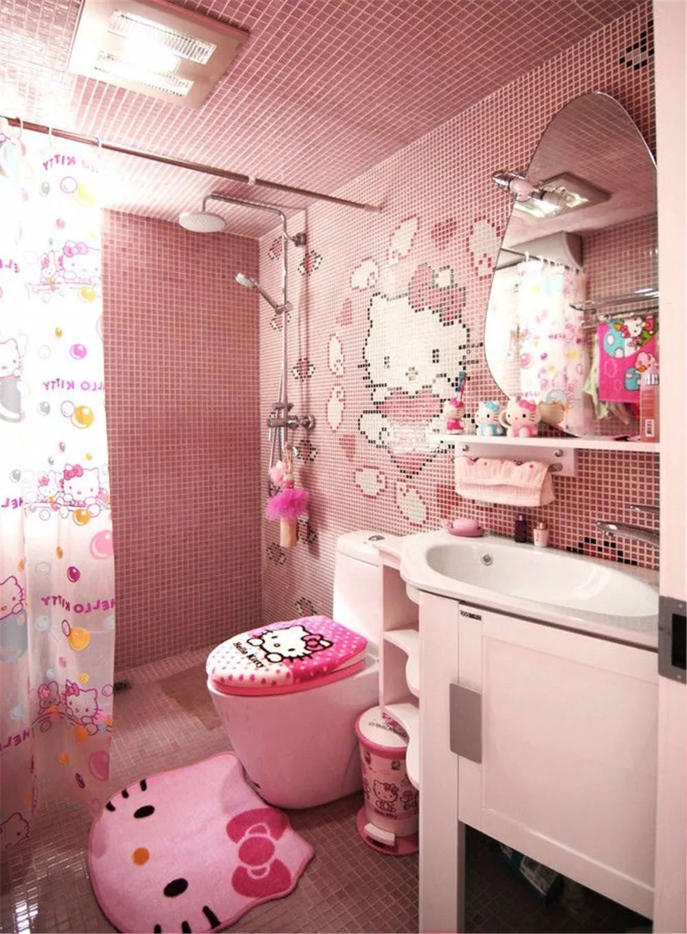▼走進浴室,Hello Kitty的元素撲面而來。粉紅色的馬賽克格子牆,上面有一個大大的Hello Kitty圖案。牙刷杯、馬桶墊、地墊、毛巾、浴簾,這些東西上都是Hello Kitty的圖案。