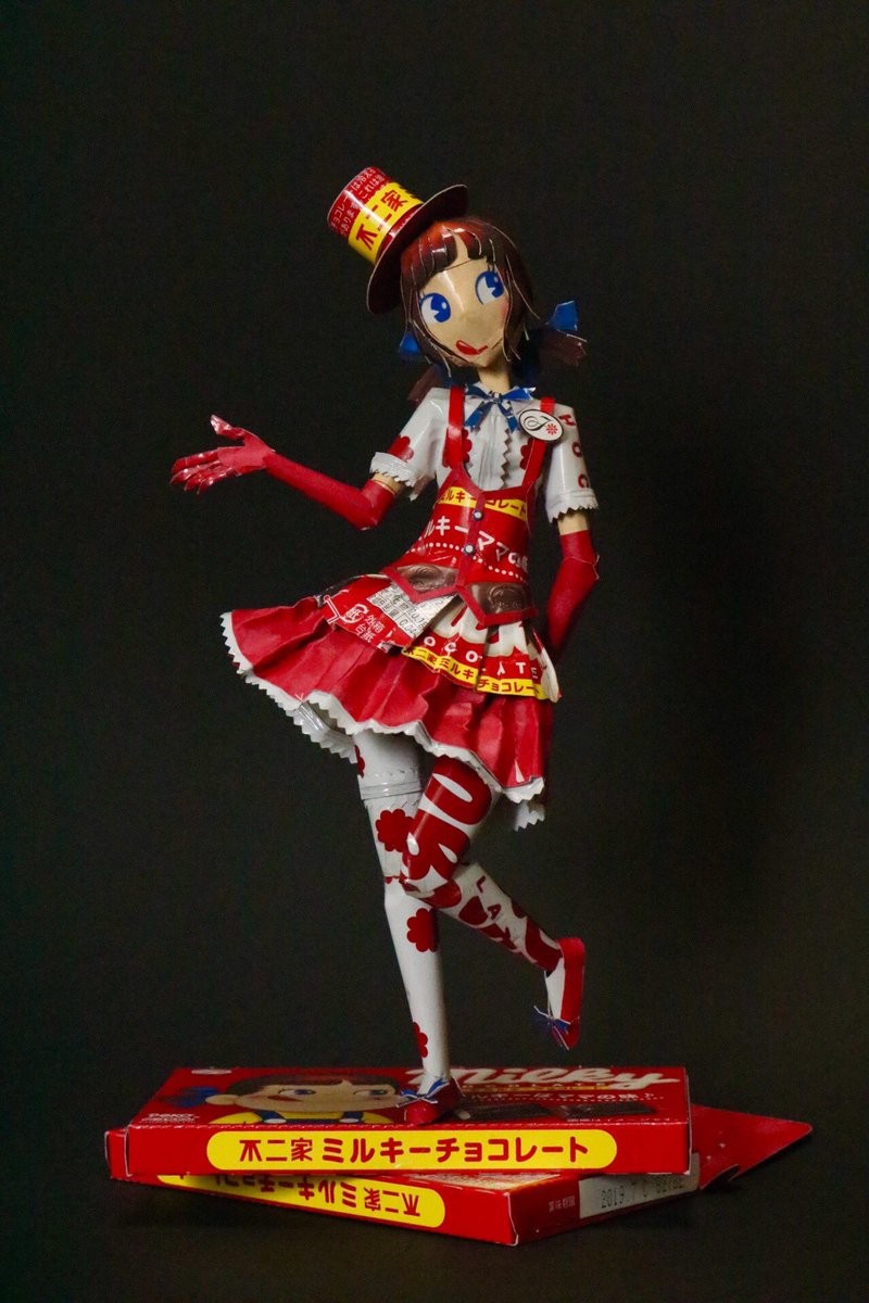▼整個公仔用不二家牛奶巧克力空盒製作,牛奶妹Peko的臉更加俏皮可愛。紅色的舞鞋,飄逸靈動的百褶裙,時尚的禮貌,這一切都是由空盒改造完成的。