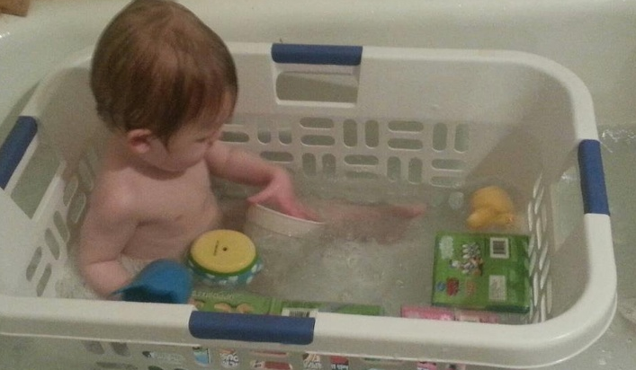 ▼孩子還不習慣在浴缸洗澡?那就用洗衣籃來幫忙吧~防滑效果很好!