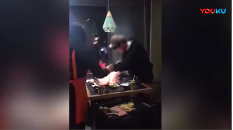 ▼男生連忙拿起漏勺,翻找被丟進火鍋中的手機。他頻頻回頭看離開的女友,想要追上去,又不能丟下手機不管,最後還是決定先救手機再說。